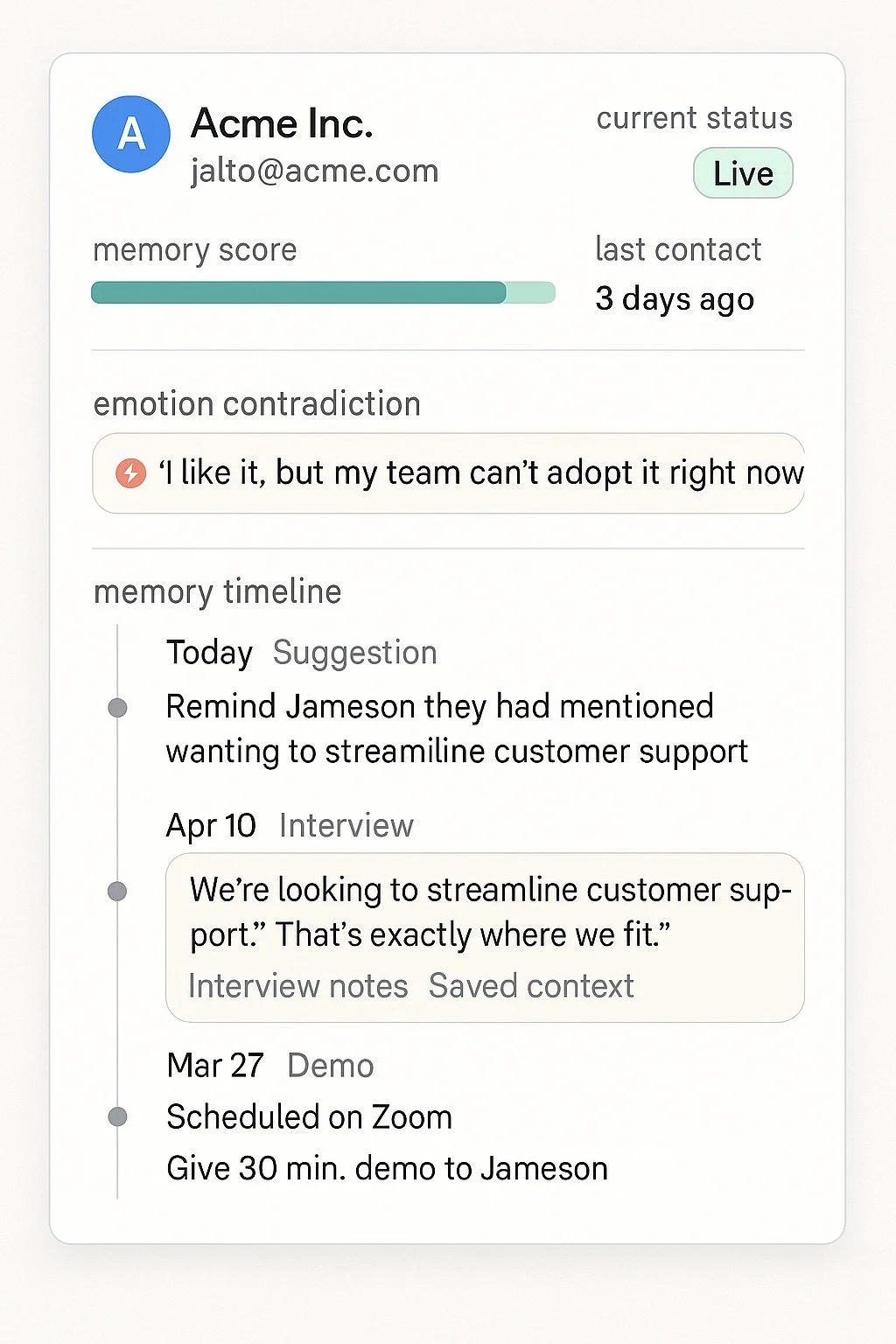 Every promise, follow-up, and customer signal — captured, remembered, and turned into action.